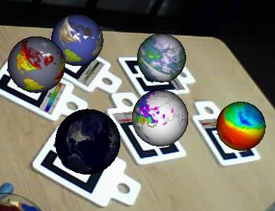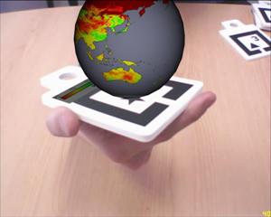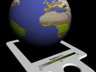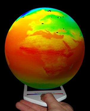 Each paddle visualises Earth data including Earth lights at night, population, vegetation, rainfall, surface temperature and reflectance. Each is related to the others (population is related to vegetation, which is related to surface temperature, which also impacts population etc).